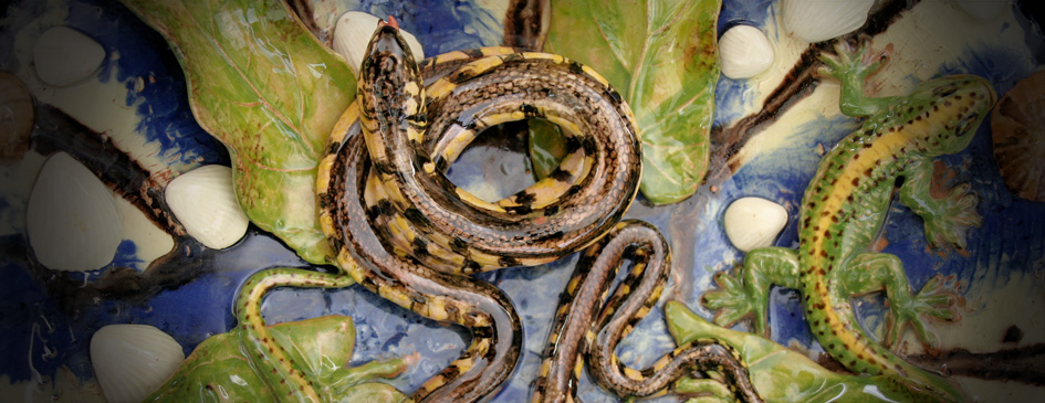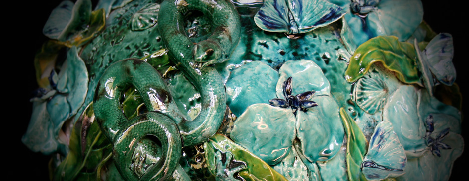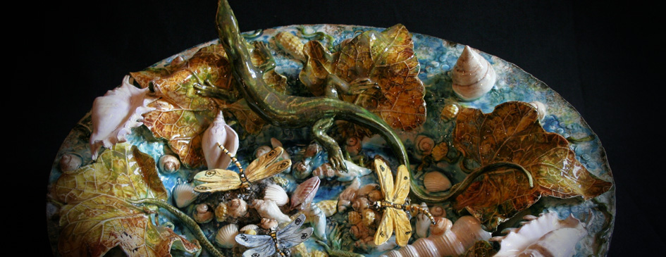 Christine Viennet, dans le sillon de Bernard Palissy durant de nombreuses années, s´inspire de l´œuvre naturaliste de ce grand humaniste et céramiste de la Renaissance. Elle lui consacre un livre, collectionne les créations de ses suiveurs depuis l´âge de 16 ans…