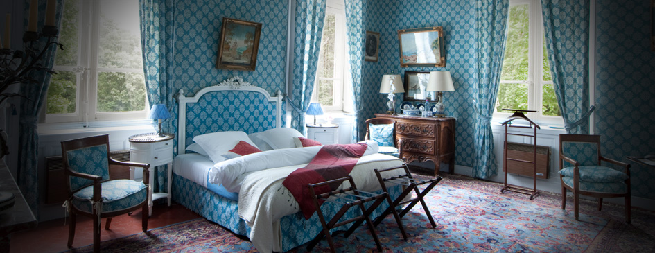 La chambre Bleue, dite ''La chambre des Ambassadeurs'', est élégante et spacieuse, elle se situe au 1er étage du château avec une double vues sur le parc.