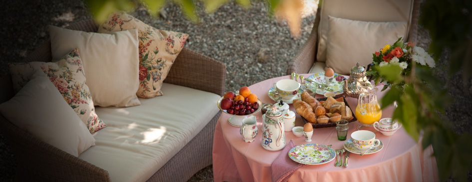 Petit-déjeuner à la française avec croissants, pains variés, confitures maison dont la succulente gelée d´azeroles du jardin, fruits et yaourts à l´ancienne, servi dans le jardin ou dans la salle à manger XVIIIème.