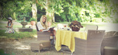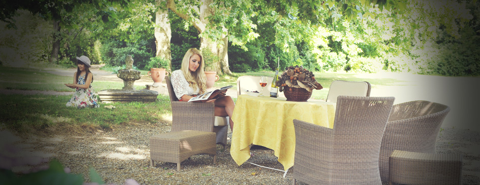 • Jardin: table et tables rondes, chaises, parasols, chaises longues, BBQ…