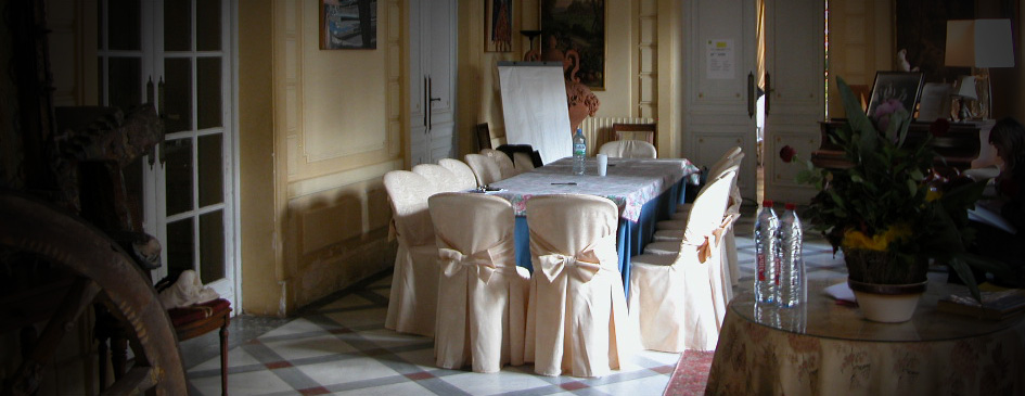 A bright and pretty room with two sliding door separations at each end, high ceilings, parquet floor and sumptuous white wooden panels is the ideal place for dinners, seminars and committees. Seven large bay windows lead you directly into the garden.